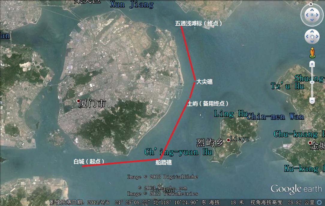 拉力赛起点:厦大白城外海(起点) ——(1标:红旗左舷绕,绿旗右舷绕)——转折点:24°24′47.7″N,118 °09′10.6″E(船路礁灯标)——转折点:土屿三个黄色灯标(备用终点)——大尖礁灯标——五通浅滩标(终点)——五缘湾大桥
