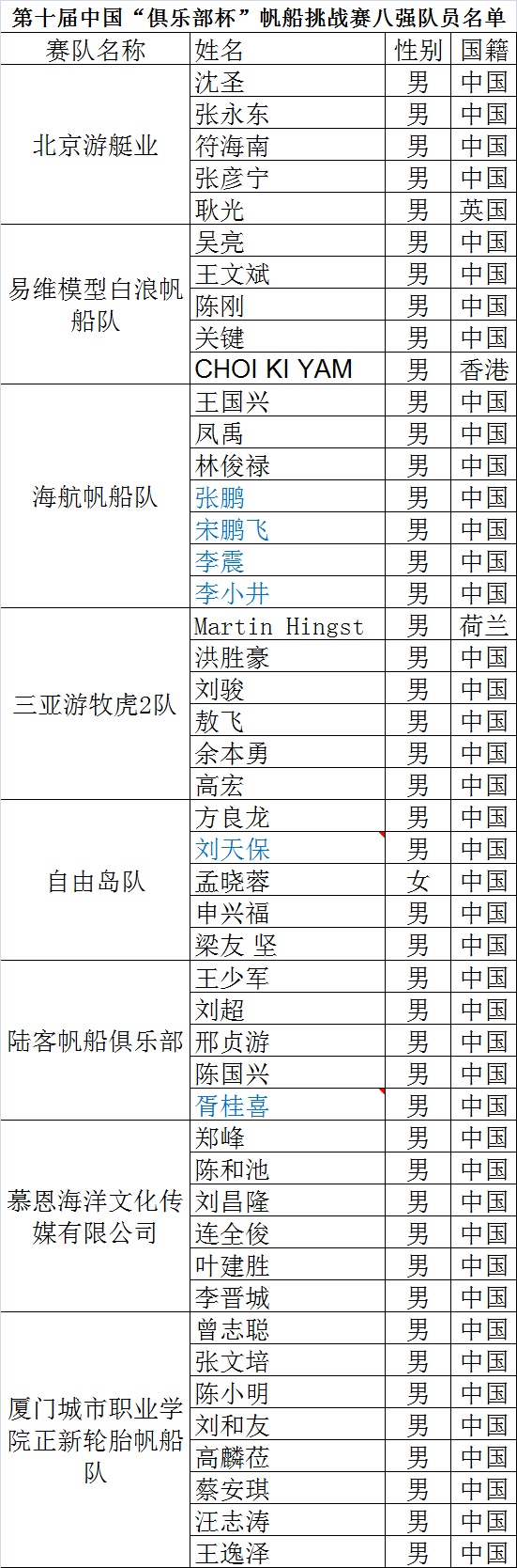 >第十届中国“俱乐部杯”帆船挑战赛八强队员名单