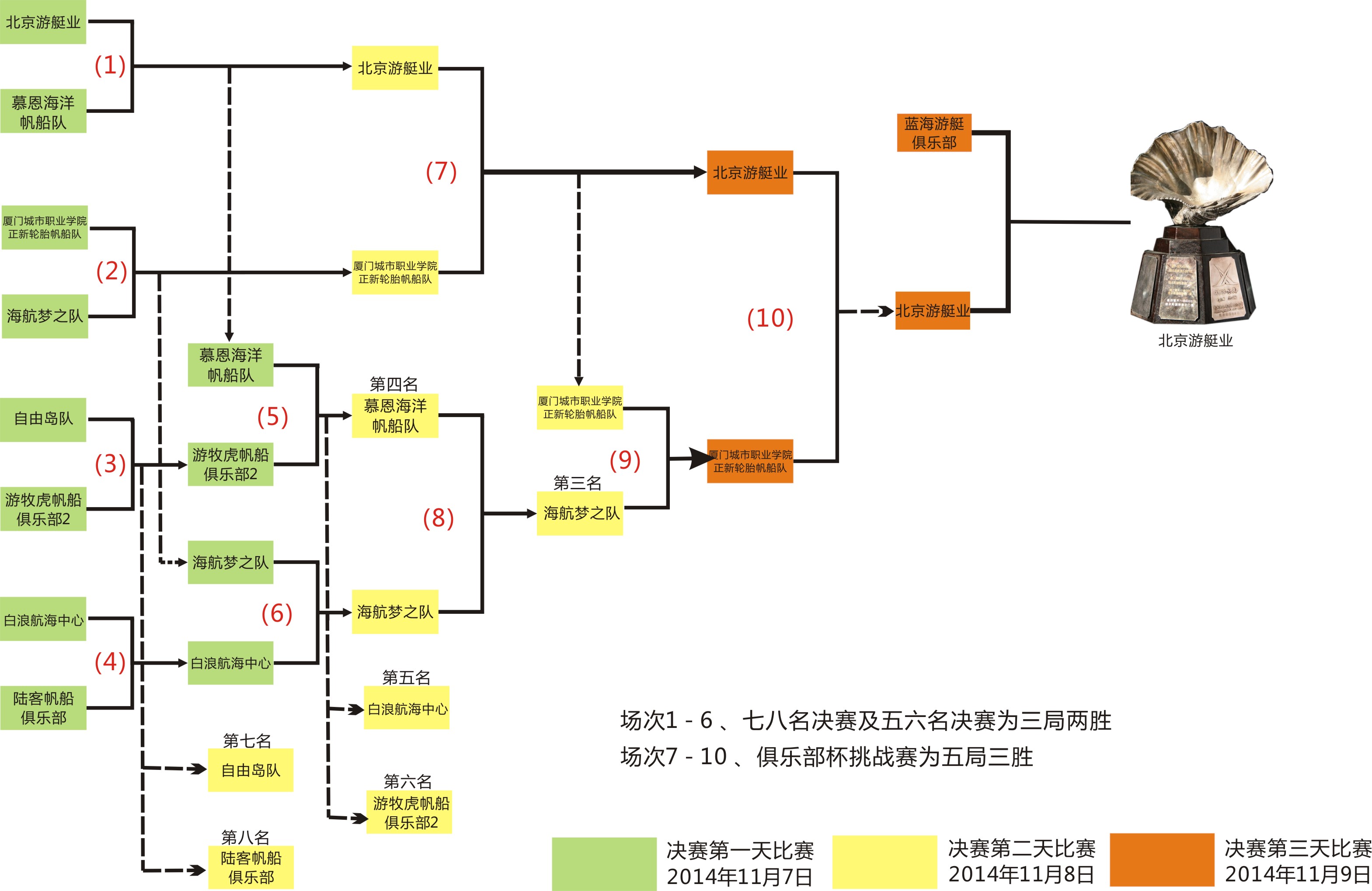 北京游艇业帆船队取得了与上届冠军厦门蓝海帆船俱乐部挑战的资格,并且挑战成功,成为了本届俱乐部杯的最后赢家捧起了代表中国大帆船最高竞技水平的中国“俱乐部杯”大贝壳奖杯。