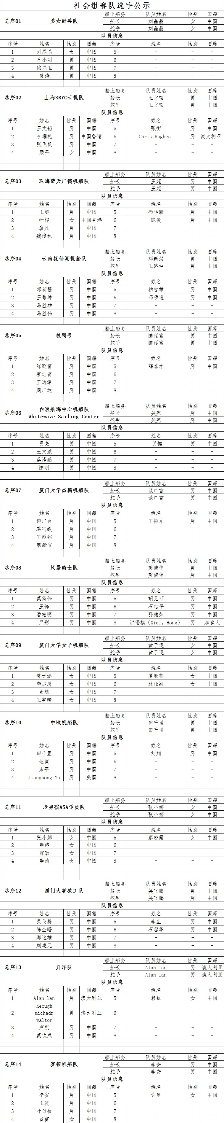 >第12届中国“俱乐部杯”帆船挑战赛赛队及选手公示