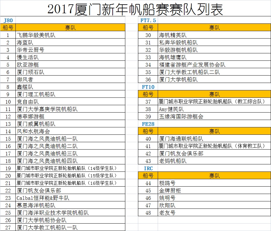 >2017厦门新年帆船赛参赛队伍